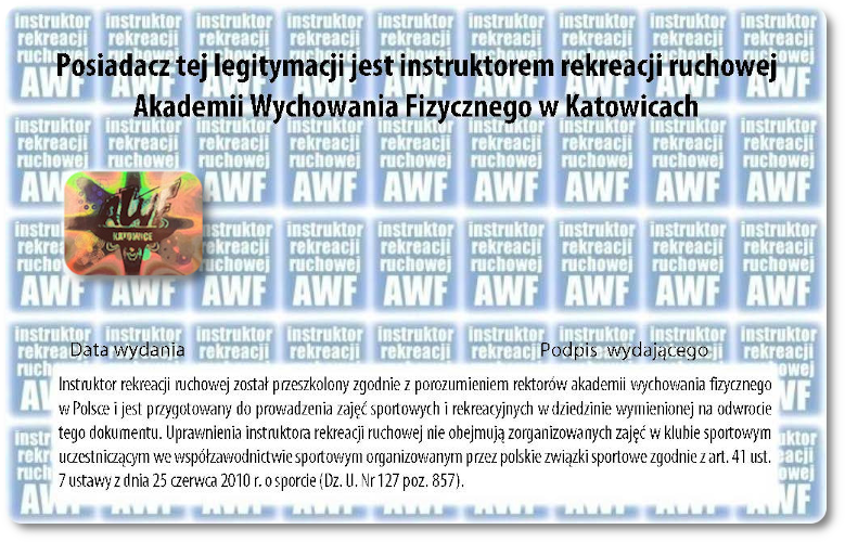Po ukończeniu części teoretycznej i specjalistycznej uczestnicy otrzymują legitymację instruktora rekreacji AWF w określonej specjalności.